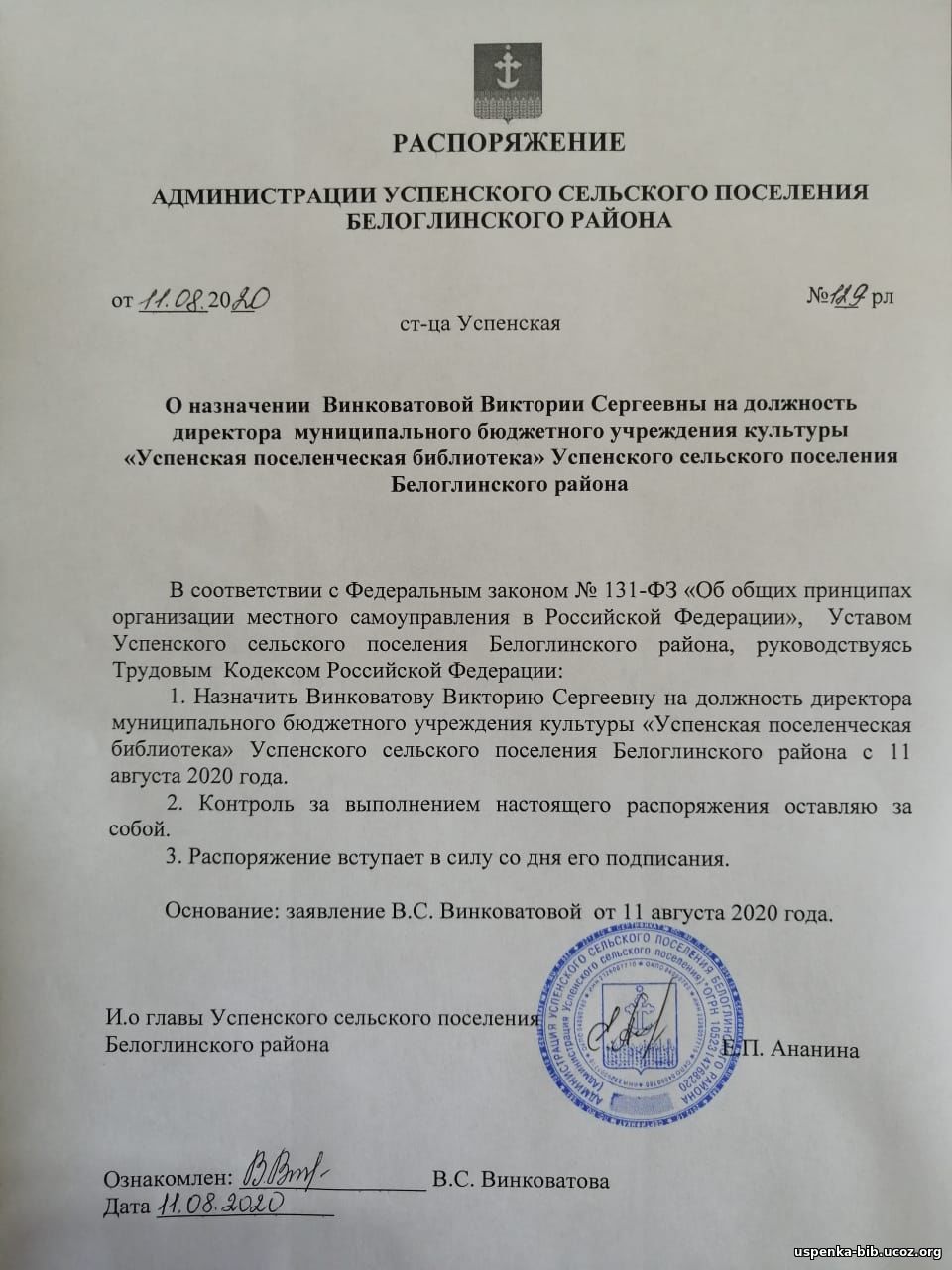 Распоряжение администрации Успенского сельского поселения Белоглинского район от 11.08.2020 г. №129-рл "О назначении Винковатовой В.С. на должность директора МБУК "Успенская ПБ".