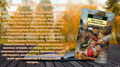 Этот роман неоднократно экранизирован, в том числе и в нашей стране. Фильм, снятый на его основе, стал поистине культовым. Идет время, сменяются эпохи, но читатели по-прежнему не могут оторваться от совершенно невероятной истории путешествия троих беззаботных английских джентльменов, пустившихся в плаванье по Темзе вместе со своим любимцем – фокстерьером Монморанси. Забавные недоразумения, веселые коллизии и полные комизма ситуации, из которых герои выходят, неизменно сохраняя истинно британское чувство собственного достоинства, и сегодня поражают своей оригинальностью и неувядающим юмором…