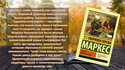 Для того, чтобы написать этот культовый роман, тогдашний редактор киносценариев бросил работу, заложил машину и задолжал всей округе — лавочники считали, что вносят свою лепту в написание чего-то великого, но кормить семью Маркеса бесплатно все же не желали. Многослойное, неспешное повествование о жизни огромной семьи в затерянном бог весть где городишке, пронизанное сочными образами и плотной магией невозможного: “вещи тоже живые, нужно только уметь разбудить в них душу”. Удивительно выпукло нарисованные характеры героев и гипнотизирующий даже в переводе слог.