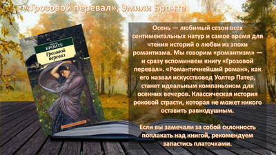 Осень — любимый сезон всех сентиментальных натур и самое время для чтения историй о любви из эпохи романтизма. Мы говорим «романтизм» — и сразу вспоминаем книгу «Грозовой перевал». «Романтичнейший роман», как его назвал искусствовед Уолтер Патер, станет идеальным компаньоном для осенних вечеров. Классическая история роковой страсти, которая не может никого оставить равнодушным. Если вы замечали за собой склонность поплакать над книгой, рекомендуем запастись платочками.