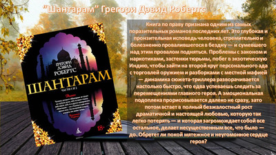 Книга по праву признана одним из самых поразительных романов последних лет. Это глубокая и пронзительная исповедь человека, стремительно и болезненно провалившегося в бездну — и сумевшего над этим провалом подняться. Проблемы с законом и наркотиками, застенки тюрьмы, побег в экзотическую Индию, чтобы зайти на второй круг персонального ада с торговлей оружием и разборками с местной мафией — динамика сюжета-триллера разворачивается настолько быстро, что едва успеваешь следить за перемещениями главного героя. А эмоциональная подоплека прорисовывается далеко не сразу, зато потом встает в полный безжалостный рост драматичной и настоящей любовью, которую так легко потерять — и которая загромождает собой все остальное, делает несущественным все, что было — до. Обретет ли покой мятежное и неугомонное сердце героя?