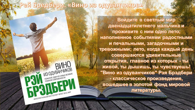 Войдите в светлый мир двенадцатилетнего мальчика и проживите с ним одно лето, наполненное событиями радостными и печальными, загадочными и тревожными; лето, когда каждый день совершаются удивительные открытия, главное из которых - ты живой, ты дышишь, ты чувствуешь! "Вино из одуванчиков" Рэя Брэдбери - классическое произведение, вошедшее в золотой фонд мировой литературы.