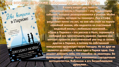 В книгу входят две повести. «Медовый месяц в Париже» – это предыстория событий, которые разворачиваются в романе Мойес «Девушка, которую ты покинул». Лив и Софи разделяют почти сто лет, но они обе стоят на пороге семейной жизни, обе надеются на счастливый медовый месяц с любимым мужчиной... «Одна в Париже» – это рассказ о Нелл, скромной и любящей все просчитывать заранее. Однако она мечтает провести романтический уик-энд со своим другом в Париже, а потому по собственной инициативе организует такую поездку. Но ее друг не является на вокзал, и Нелл едет в Париж одна. Она решает доказать себе, что способна на авантюры. Во французской столице Нелл знакомится с загадочным мотоциклистом Фабианом и его бесшабашными друзьями…